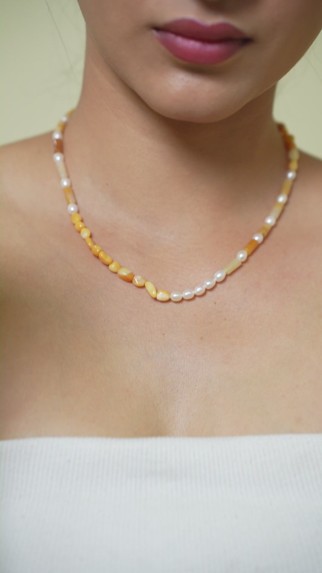Natural Yellow Calcite and Yellow Jade Tubes with Pearl Necklace
