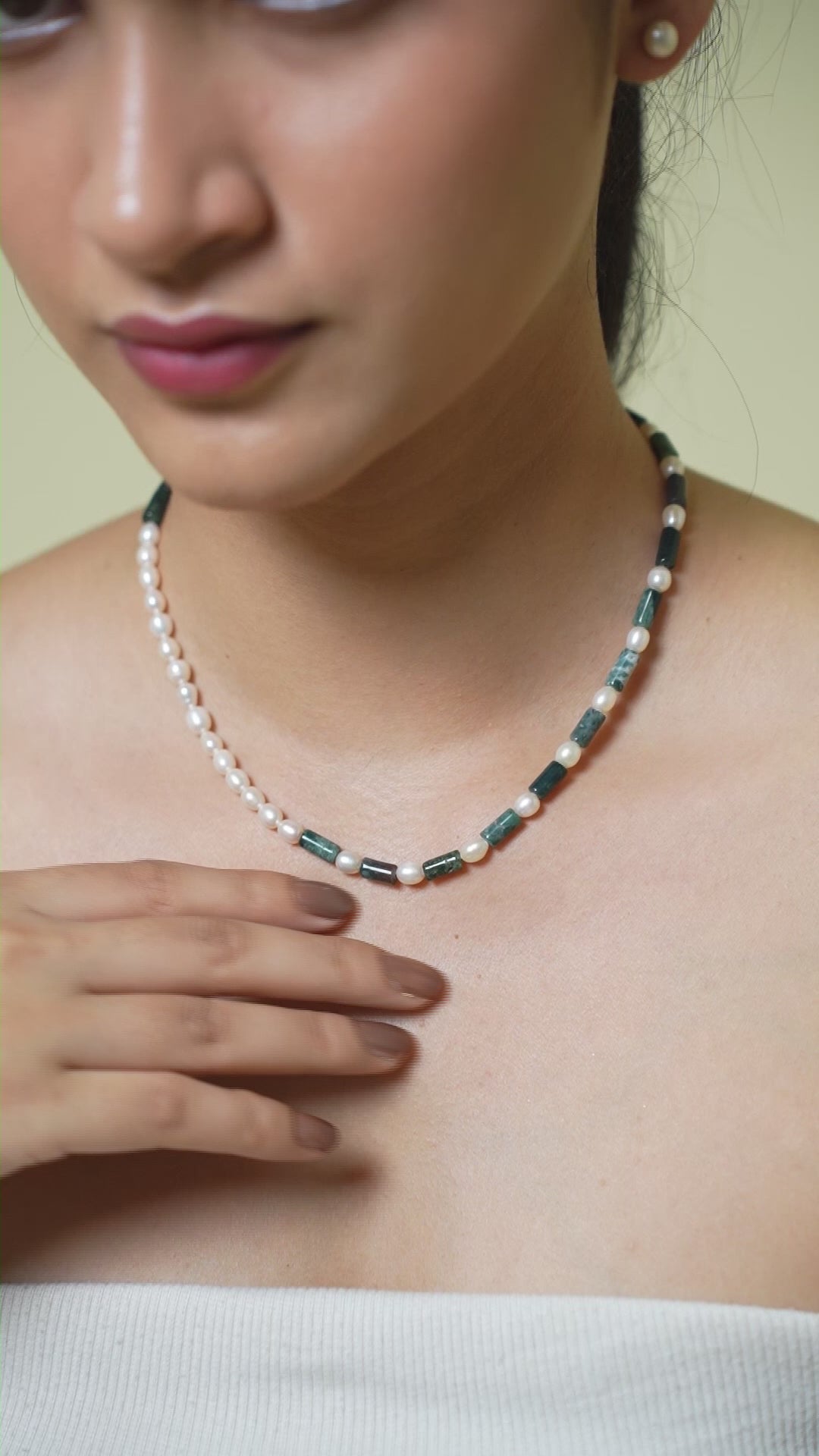 Natural Dark Green Jade Tubes with Pearl Necklace