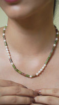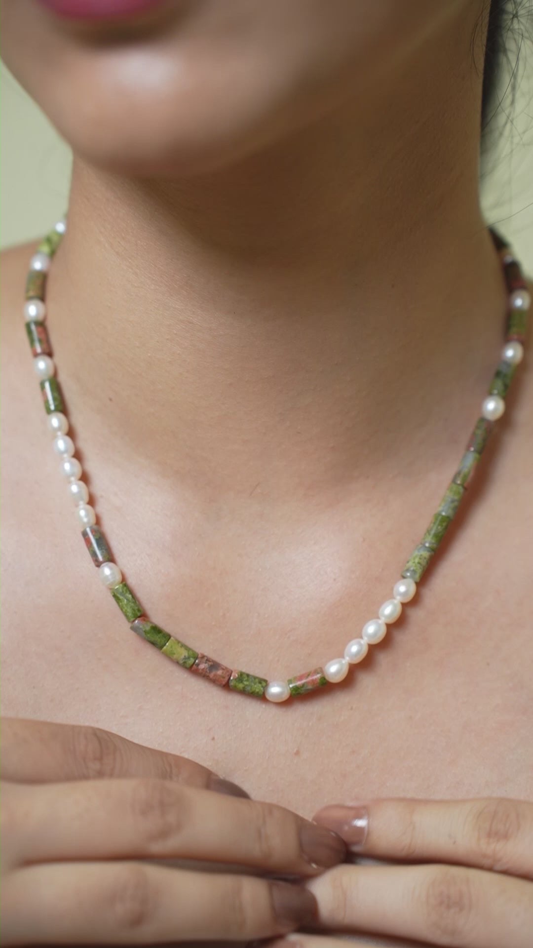 Natural Flower Green Unakite Tubes with Pearl necklace
